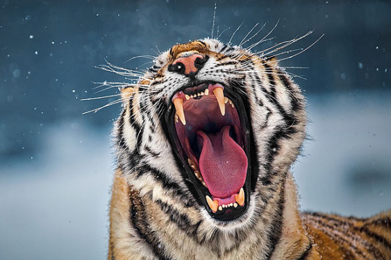 这是一幅美感和反思兼具的优秀摄影作品。正所谓“虎啸一声群兽惧,鹰鸣长空众禽栖。”东北虎的美,来自它的大气和不怒自威。无奈生态恶化,肆意捕杀,让东北虎的数量日益骤减。拍摄者抓拍到了雪地里虎啸的镜头,结合现实环境来解读这幅作品,总有“一语双关”之感。