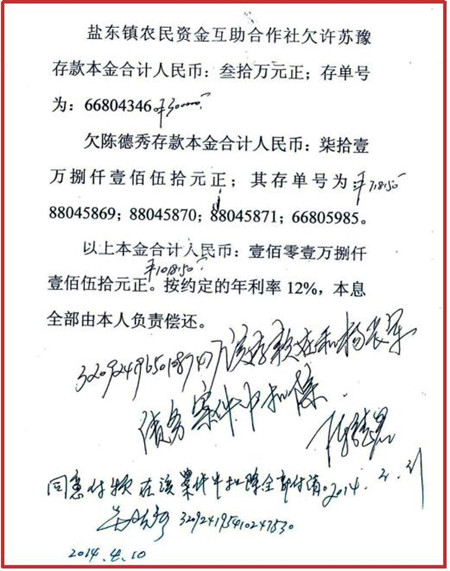 2012年11月7日,许苏豫在互助社存款30万元,约定年利率为3.5%,后因互助社对外借款不能收回,暂不能偿还所有的到期存款,储户(主要为当地农民)上访,后由当地镇政府出面处理,已分期还款(记者注:判决后许苏豫还在互助社领取了四期还款)。