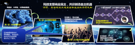 这种精神就是刚才说的自主的、自动的共识。这个共识如果有一些物联网、芯片加进来,就变成一种共决机器。投票的动作不用人工。发微信、下订单甚至开空调,都做一次投票。这个过程就形成自主的机器。全球都加了区块链,商业某个环节、社会环节都加了区块链,全球人人共同参与区块链,一个新的地球、一个新的全球网脑就形成了。共识机制创造自主的智能机器。这样的科技支撑了共识商业。