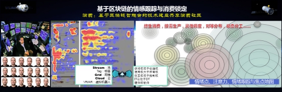 上面这个图中间的红色区域,可以认为是用红外线探测一个小区,在几栋楼、一个广场的某个时间点大家的活动区域。右侧部分可以认为是探测脑电波的阿尔法场。这个区域内大家的阿尔法波。有些人是很精细、有的人是很宽广的。这个特征可以发到区块链,大家共同建立一种共识、建立一种对接。这个时候形成大家共同的信任。左侧那个图是FBI用来测谎的,通过人的表情、激情。刚才郭主席上来的时候很从容,之后沉默了一下,后来又很自在。这个过程可以测出脑电波的变化。而这时测出的数据可以在区块链上形成一个流,形成基于人性的一种信任流。当这样做时可以按他的需求进行生产,可以灵性地调度商业,可以形成终生消费。