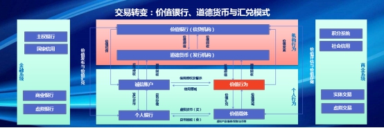 社会转变之后,交易变化了。交易将基于个人的银行、基于个人的货币。每个人都要建立一个诚信的账户,公开透明地记录自己的价值行为。这样的价值行为记录到价值银行中,交易就变成价值的汇兑。这样,基于个人价值发行的货币就多了是了,可以生成各种货币,可以形成一系列银行。一切都通过技术发起一个共识邀约,通过大家做价值标识,然后形成一个东西,通过共同的价值观把它标出来,形成价值银行账号。