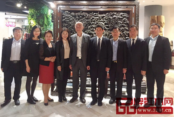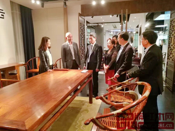 中国家具协会理事长朱长岭(左三)一行欣赏了泰和园经典作品,并对作品进行了评价