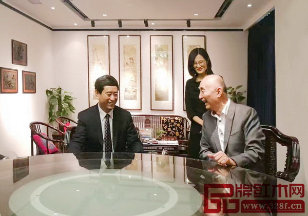 中国家具协会理事长朱长岭(左)与泰和园董事长邵湘文(右)进行了深入交流,并赞叹泰和园乃中国红木家具民族品牌的代表