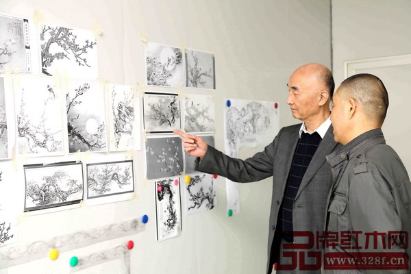 泰和园董事长邵湘文(左)与泰和园设计部部长吴兴华探讨产品设计,坚持设计要达到极致美的理念