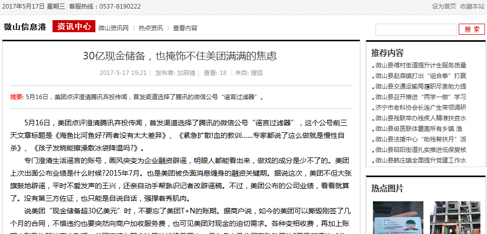 5月16日,美团点评澄清腾讯弃投传闻,首发渠道选择了腾讯的微信公号“谣言过滤器”,这个公号前三天文章标题是《海鱼比河鱼好?两者没有太大差异》、《紧急扩散!血的教训……专家都说了这么做就是慢性自杀》、《孩子发烧能擦澡敷冰袋降温吗?》。