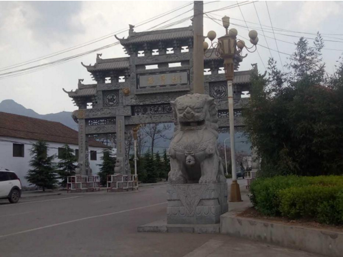(案发现场林州市西丰村村口,“肇事”的石狮子还伫立在那里)