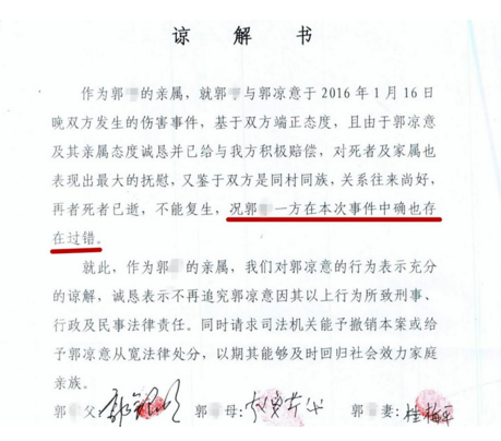 (被害人亲属及被告人亲属达成了谅解协议,其中被害人家属承认死者郭某存在过错)