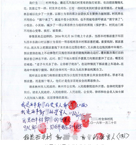 据悉,郭凉意西丰村事件致郭某死亡后,姚村镇西丰村、坟头村、井湾村等几千名村民,林州市部分人大代表、政协委员联名向林州市人民政府、林州市公安局、林州市检察院等单位递交了《联名信》,请求对郭凉意从轻处罚。