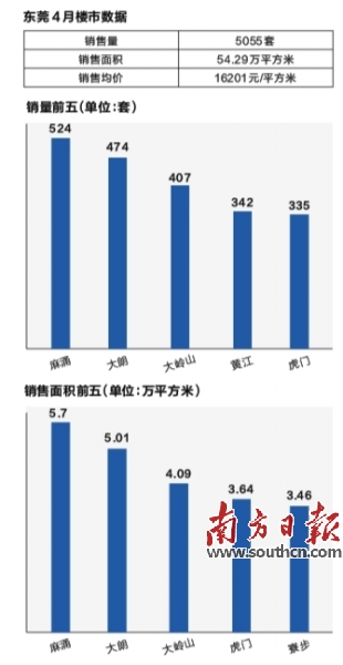 此外,4月全市新建商品住宅网上签约销售套数排前5位的镇街分别是麻涌、大朗、大岭山、黄江、虎门;销售面积排名前5位的是麻涌、大朗、大岭山、虎门、寮步。其中,麻涌镇签约524套住宅,签约均价12572元/平方米,成交套数在全市占比达到一成,大大拉低了整体房价。