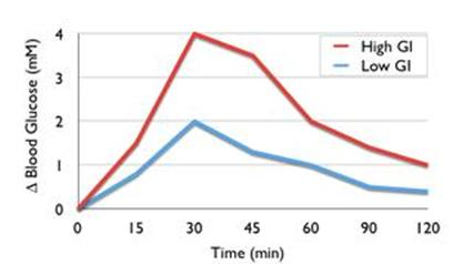 另外低升糖也十分重要,为了降低用户身体脂肪的产生,健康减脂专家脂老虎从低升糖的食物提取相关成分。从下图可以看出,低升糖食物可以让血糖更加缓慢的提高,同时其峰值也与高升糖食物相比低很多,在人的身体血糖不会过高的情况下,胰岛素就不会起更多的作用,从而防止多余的血糖转化成脂肪。
