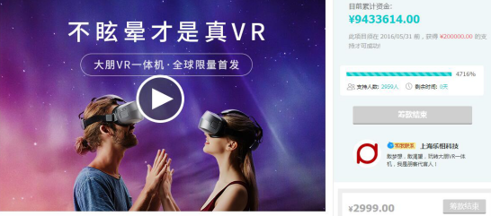 ☞ 4月1日,开启淘宝众筹,售价2999元的大朋VR一体机最终以¥9433614众筹金额,创下VR行业众筹纪录。