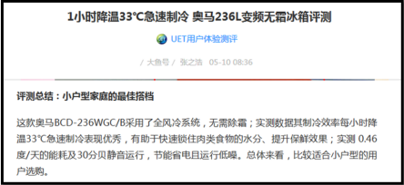 经过一翻的市场调研后,笔者对奥马BCD-236WGC/B为何成为爆款有了一定的了解。之后,又在网上对该款冰箱进行查询时发现,中国家电器研究院曾经对此款冰箱做过评测,其给出的结论是“1小时降温33℃急速制冷;实测 0.46度/天的能耗;30分贝静音运行;比较适合小户型的用户选购;“