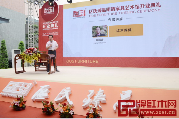 区氏臻品明清家具艺术馆开业典礼当天,全联艺术红木家具专业委员会专家顾问、华南农业大学博士生导师李凯夫带来了主题为“红木保健”的精彩讲座