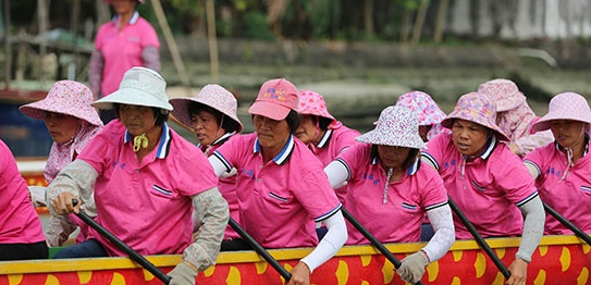 “预备……划!”随着一声令下,两艘龙舟如离弦之箭破开水面,疾速向前冲去,龙舟上统一穿着粉红色衣服的队员们在烈日下奋力划桨。此刻驻足麻涌镇漳澎村龙舟训练河段旁,你听到的不是男性雄浑的吆喝声,而是略带轻盈的女声。