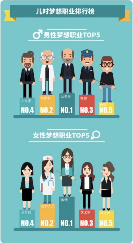 据领英儿时梦想调查,无论是哪个年龄段的职场人,小时候最普遍的梦想都是公务员、教师、科学家、医生这类稳定且社会声望较高的职业。年少时的职业梦想往往来源于当时的所见所听,与个人成长环境有很大关系。而大多数小孩的可见范围内无非是几个常见的传统工作,或只是随口说的孩子气答案,很容易就忘了,真正能兑现的少之又少。