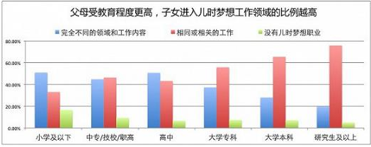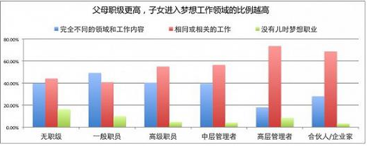 调查数据显示,父母最高的学历或者工作职级越高,其子女实现梦想职业的比例越大。当父母最高学历在研究生及以上时,其子女从事与梦想职业相同或相关工作的比例高达75.6%,是父母最高学历仅小学及以下的两倍多;当父母为高层管理者或企业家时,其子女从事相同或相关工作的也占7成以左右,明显高于父母为中低层职员的情况。