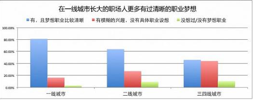 虽然绝大多数都至少有模糊的兴趣,但家乡城市发展程度越高,小孩的梦想职业愈发清晰。一线城市长大的职场人儿时有比较明确理想职业的比例几乎是三四线城市的两倍。