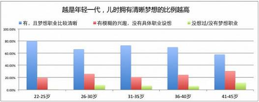 没有完全变成年少时希望的样子也并不要紧,出于各种现实原因,近一半人做着与曾经梦想职业完全不同的工作,只有13%从事了与梦想职业完全相同的工作,4成人留在了相关领域。但高达75%的人都为之付诸过努力,并且超过8成人都表示未来在条件允许的情况下仍然会去继续追求,而工作6至10年是转行去追逐梦想的黄金期。
