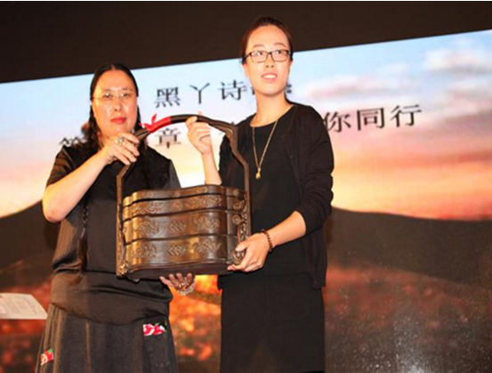(诗人黑丫将收藏多年的聚宝提梁食盒赠予中华万丰小吃博物馆,董事长侯景辉女士并代表侯嘉先生表示衷心的感谢)