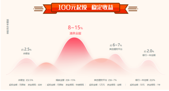P2P网贷作为普惠金融的主要组成部分,以服务中小微为主体。以目前业内领先的创新金融服务平台——涌泉金服为例:涌泉金服提供8-15%稳建投资收益产品,新手专享7天15%预期年化收益产品。热销产品为1个月8.5%,3个月9.2%,6个月10.3%;100元起投,用户可以灵活选择从1-6个月不同投资期限的产品。投资1个月的收益相当于银行1年存款收益,现在注册还送1000元现金红包。