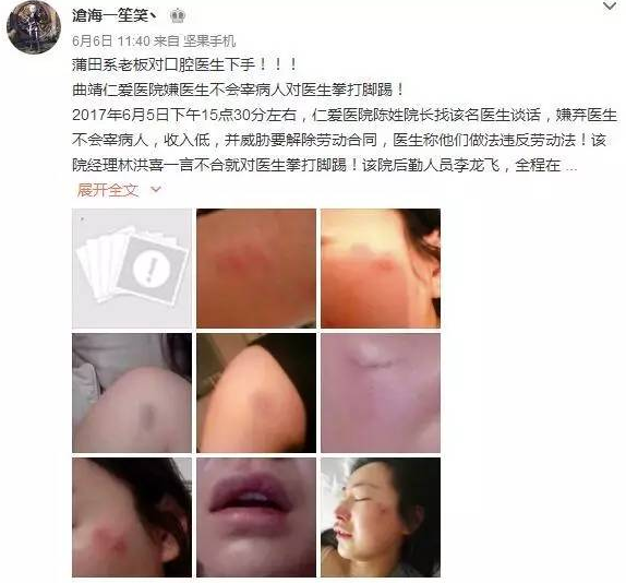 微博爆料出现在6月6日上午11点多。网友@滄海一笙笑丶发布微博称:蒲田系老板对口腔医生下手!!!曲靖仁爱医院嫌医生不会宰病人对医生拳打脚踢!