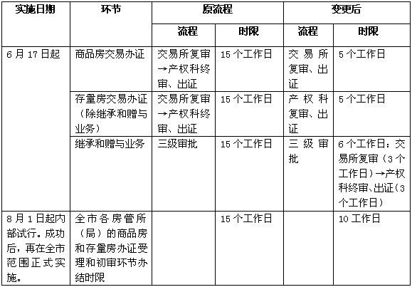张俊阳介绍,从6月17日起,市房管局调整了房屋交易办证程序,商品房交易办证、存量房交易办证工作时限缩减至5个工作日,继承和赠与业务工作时限缩减至6个工作日。同时,从8月1日起已开始试行将全市各房管所(局)的商品房和存量房办证受理和初审环节的办结时限由原来的15个工作日缩减至10工作日。试行成功之后,将在全市范围正式实施。