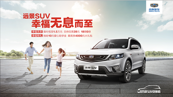 在远景SUV迅速赢得10万个家庭选择的背后,除了产品的硬实力之外,还有吉利远景SUV带给家庭用户满满的幸福感这种软实力的推动。远景SUV自诞生之日起就是一款有爱有温度的产品,譬如上市前助力韩红百人援甘公益行动,成为甘肃地区“医疗巡诊用车”;上市当天启动远景SUV百人助学计划,并一直开启的幸福十元助学活动;今年全国多地举办的幸福亲子秀,并借“二月二,龙抬头”中国传统风俗推广“抬头操”公益活动,预防手机低头族颈椎病,可以说,远景家族产品主打的“幸福”理念在远景SUV上不断地深化和延续。