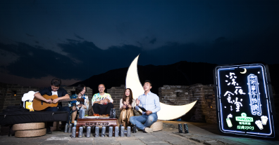 晚上7点半,天色黑下来,落在人间的大月亮为古老的长城平添了几分诗意。烤腰子,羊肉串,啤酒,花生加毛豆……一群来自不同领域的艺术家,音乐人,综艺达人和一些年轻人围坐在烽火台上,弹琴、唱歌、喝酒,讲故事、创作、直播,把深夜食堂搬到了长城上。
