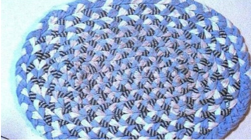 Step4:编好后,留30厘米布条作为地毯的“心”,然后围着这条中心开始缠绕编织,一边编一边从背面缝合;