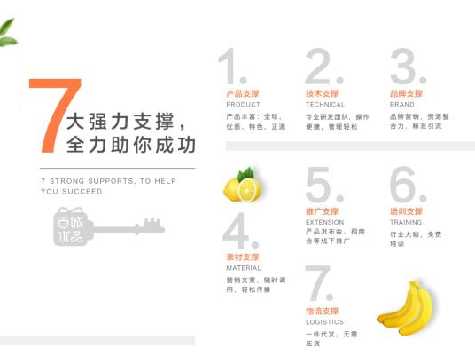 百城优品的七大支撑体系:全球优质特色的正宗原产产品支撑、专业研发团队的技术支撑、强大的品牌支撑、营销文案的素材支撑、多手段的推广支撑、营销大咖的免费培训支撑、一件代发的物流支撑,真正可以做到让分享分销者不用担心货源、资金、仓储、发货、售后等一系列琐碎的问题。