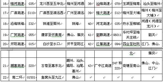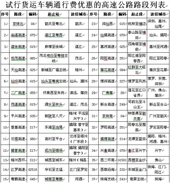 根据安排,从7月1日0点起(以高速公路出口时间为准),在保持现行货运车辆计重收费基本费率及计费规则不变的前提下,省内43条高速公路试行货车通行费八五折优惠措施。其中属于广东省交通集团的高速公路有二广、京珠北、江罗、潮惠、平兴等40个路段,属于广东省南粤交通公司的韶赣等3个路段。