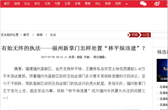 近日,中共福建省委决定,王宁同志任中共福州市委委员、常委、书记,从而成为福州市新的掌门人。王宁这位在住建部供职多年,对建筑法、土地法了如指掌的新领导,他会对林平妹、王善栋的违法建筑“中榕·高科城项目”怎样处置呢?是睁一只眼闭一只眼纵容其违法行为还是严格执行国家法律法规拆除违建呢?