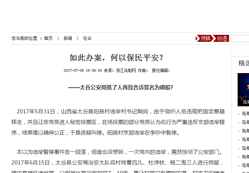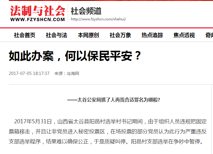 2017年5月31日,山西省太谷县阳邑村选举村书记期间,由于组织人员违规把固定票箱移走,并且让非党员进入秘密投票区,在场投票的部分党员认为此行为严重违反支部选举程序,结果难以确保公正,于是质疑叫停。阳邑村支部选举在争吵中暂停。