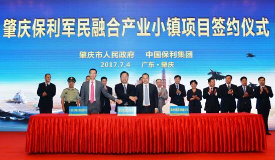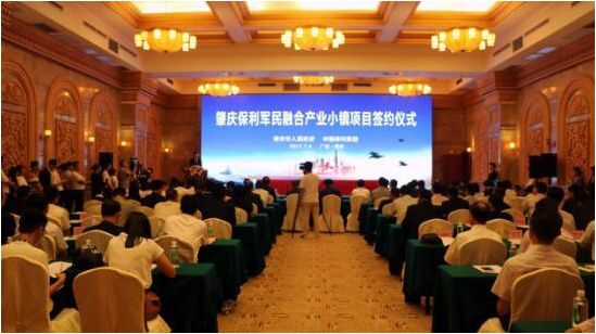 7月4日,中国保利集团与肇庆市政府正式签约建设肇庆·保利军民融合产业小镇,这标志广东省首个军民融合产业小镇项目和国防教育培训基地项目落户肇庆。广东省军民融合发展服务中心执行主任苏童表示,该小镇的建设势必推动全省“军转民,民参军”军地融合协同发展和国防教育深入普及,实现军民科技互通互融,创新经济与国防建设协调发展模式。
