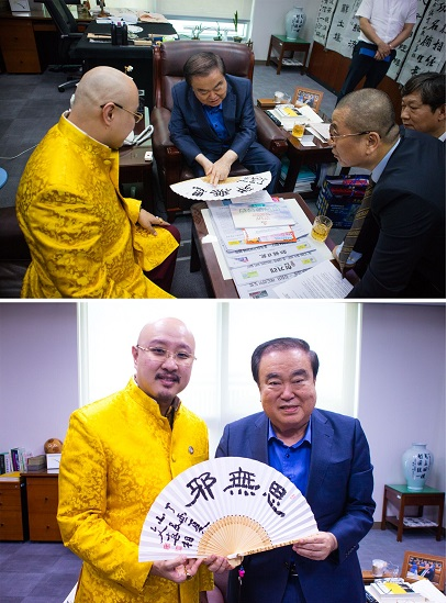 文喜相议员对此次活动表示热烈的欢迎和支持。未来将与世贸总会进一步加强往来,共同为中韩友谊的促进与发展做出努力。文議員非常重視中國傳統文化,也精通孔孟之道並練得一手好毛筆字,自己6岁的外孙女已能背诵百首中国唐诗,并将亲写书法“思无邪”赠予白玛奥色主席。