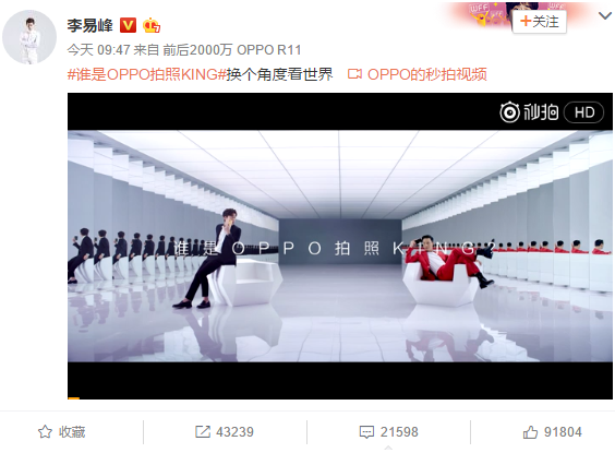 随后,同为OPPO明星家族成员的李易峰也秀出一张超酷帅照,明言“后面更精彩”,用9.6万评论、25万转发和52万点赞证明了他的超高人气,引来一众“你是我们心中唯一的KING”的欢呼。