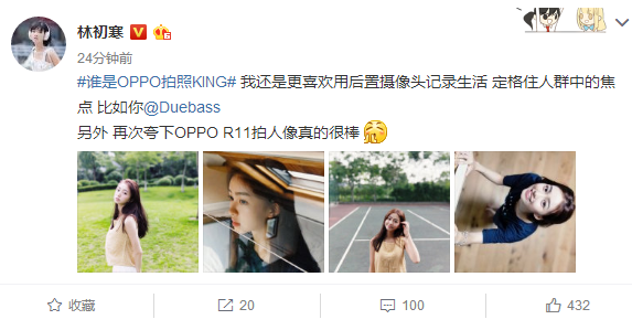 微博达人们也纷纷跟进,支持自己心爱的前置或后置拍照功能。曾与日本男神柏原崇搭档演出纯爱电影《幸福计划》的摄影师林初寒,就在微博上站队OPPO R11后置摄像头,并大赞OPPO R11拍摄人像的效果好。