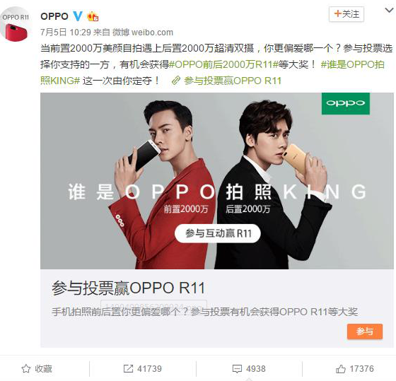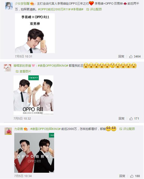 这场由于OPPO本身的强大拍照功能引发的“内斗”,以陈伟霆、李易峰的PK为导火线,迅速点燃爱拍照的年轻人的热情,纷纷以爱豆为阵容站队,并用行动来表达自己是前置党还是后置党;随后林初寒、王义博等微博大V们也纷纷加入“战斗”,有愈演愈烈之势。如果你也爱拍照,不妨与他们共同见证,这一场OPPO R11的精彩战事。