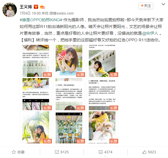 摄影师王义博也在#睡是OPPO拍照KING#的话题下站队后置拍照,还从专业角度写了一条长微博,详细讲解了如何使用OPPO R11拍出精致、清新的作品。同时,他提出要将一款红色OPPO R11手机作为奖品送给互动网友。有网友在微博下留言说“感觉比单反实用多了”,更多网友则希望自己能中奖,把这台高颜值拍照手机带回家。