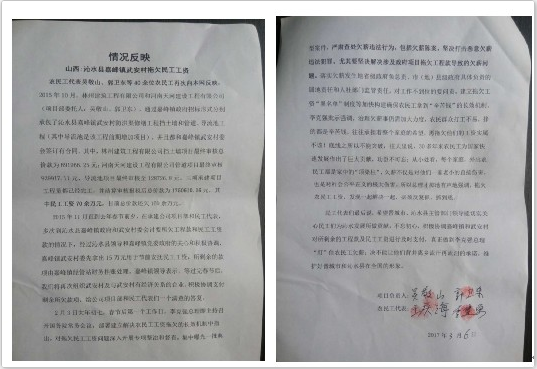 农民工代表吴敬山、郭卫东多次往返于河南与沁水之间讨要工程款及民工工资未果,40多名农民工拿不到应得的工资。郭卫东的家庭陷入极其困难的境地,逢年过节上门讨要的农民工络绎不绝,大年三十不敢回家,家里80多岁的老母亲年迈已高,经不起任何折腾,面对来家里讨债的农民工,病情反复不得不住院治疗。此外郭卫东还要面对高利贷催逼,他的女儿如今正在上高中,急需学费和生活费,但迫于现状,他都无法解决。然而嘉峰镇武安村却恶意拖欠我们民工区区160余万元的血汗钱,丝毫不顾及我们民工家庭的困难。