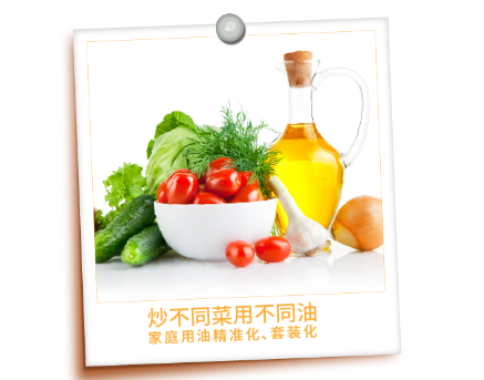 用对油不出错,健康全中国。家庭用油精准化、套装化,炒不同菜用不同油,将为中国家庭,特别是80后城市中产家庭提供健康用油体系化的指导和支持。