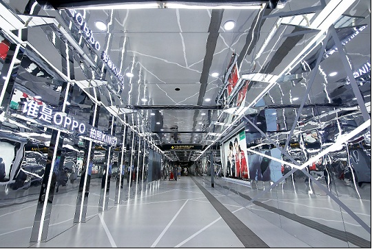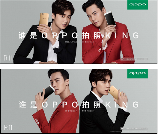 如今的上海人民广场地铁站通道可谓是光芒四射,镜面材质的通道在灯光的映衬下显得时尚酷炫。而通道两边的灯箱中,一边是帅气凌人的陈伟霆,代表着OPPO R11前置2000万美颜自拍;另一边则是颜值满分的李易峰,代表的是R11后置2000万超清双摄,在上海人民广场地铁站“现身”,上演着一红一黑的隔空站队戏码。