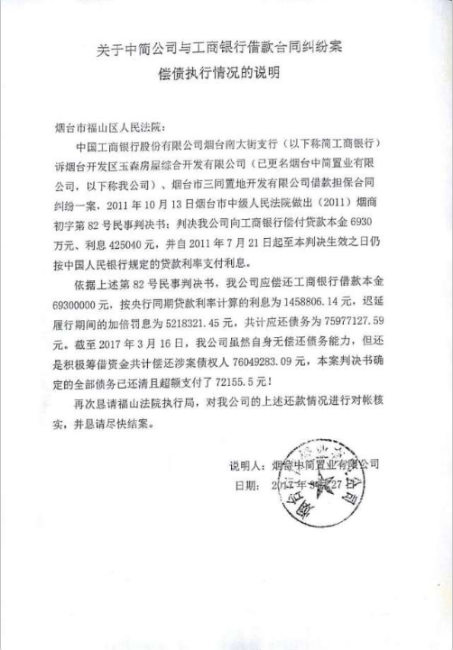 关于中简公司与工商银行借款合同纠纷案偿债执行情况的说明