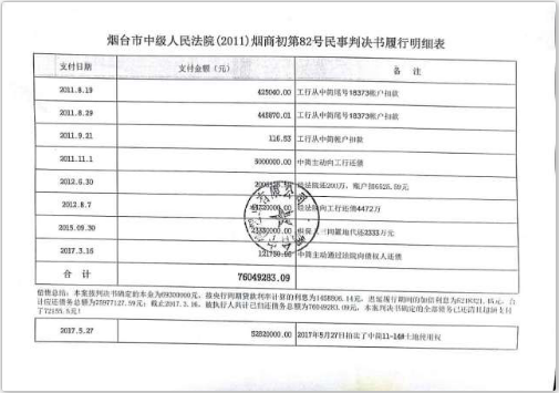 烟台市中级人民法院(2011)烟商初第82号民事判决书履行明细表