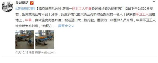 另据@泉城街坊爆料,7月12日下午5点20分左右,距离交班还有不到十分钟,负责济南北园大街三孔桥附近路段的一名六十多岁的环卫工人倒在地上中暑,据医护人员介绍,中暑环卫工人被诊断为热射病。