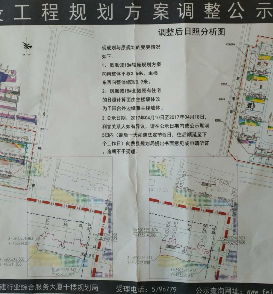 在临沂市规划局的关注下,费县规划局对原有规划方案进行调整,并于2017年4月10日进行公示。住户代表们通过费县规划局公示的建设工程规划方案调整公示图发现,新的规划方案虽然让“凤凰诚”18号楼向南整体平移2.5米,主楼东西向整体缩短0.9米;但是楼的主体高度却变成了58.35米。对于这58.35米的楼高度从哪个位置开始计算,是否包括近8米的地差,费县规划局并没有给住户们一个明确的答复。