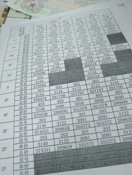 销售人员提供的房源信息表(灰色部分表示已售出)