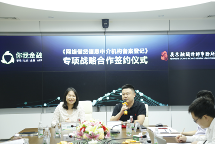 7月24日,你我金融与广东融关律师事务所就备案专项战略合作正式签署《网贷信息中介机构备案登记合作协议》,标志着你我金融在合规路上再迈坚实一步。在接下来的时间里,平台将与融关律所携手,深度合作,积极配合,在进行备案工作的同时,深入梳理公司内控制度,全面提升公司运营治理水平,为实现金融科技平台发展战略,实现“让信用更有价值”企业使命共同努力。