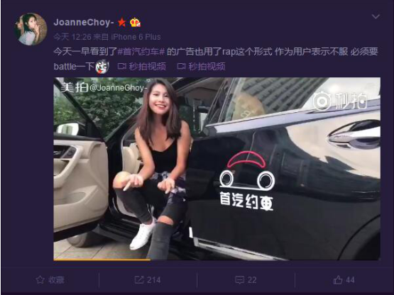 真正让这段视频火起来的是《中国有嘻哈》歌手蔡泳恩的一条微博,在这条微博中因为长相酷似昆凌而广受关注的蔡泳恩表示自己也是首汽约车的用户,甚至还录了一段Freestyle来挑战首汽约车,要和首汽约车的“小约”battle。