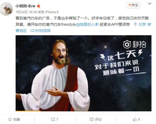 无独有偶,在蔡泳恩发出这条微博没多久,一名名为“小困困-Eve”的微博网友也放出了一段名为“上帝Freestyle”的视频。在这段视频中,网友将首汽约车Rap视频中的MV角色给替换成了上帝的形象,加上原本“Mr-God用七天来创造了这世界,这七天对于我们来说意味着一切”,正好符合了上帝七天创世的西方神话传说,更是突出了“首汽约车7天改变出行方式,红色折扣雨来袭,大礼享不停,从7月25到31,短短7天每天一个折扣等着你”的Lucky Day信息,可以说是创意十足。而这段魔性的视频也被微博大V们所转发,引起了更加广泛的传播。